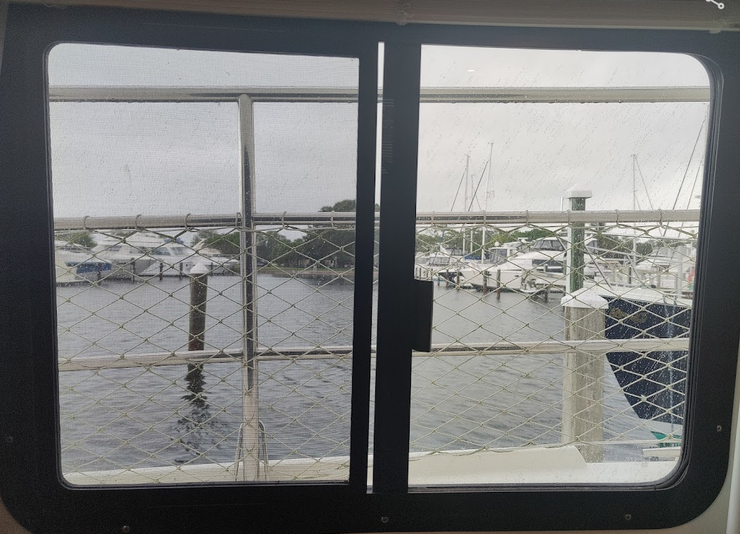 inQuest has 4 large sliding windows on the upper “Sky Lounge” deck and 5 smaller sliding windows in the galley/saloon on the main deck. They’re custom windows from Bomar, now owned by Pompanette.