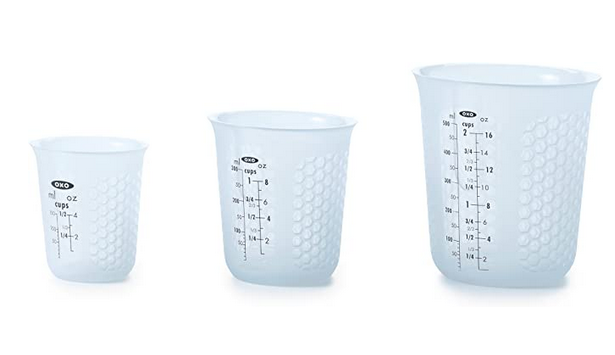 Something like these. Differing colors by size helps in selection. We keep them separate, not connected together. We don’t use silicone measuring spoons–they take up more space than nesting metal ones, and are a hassle to use.